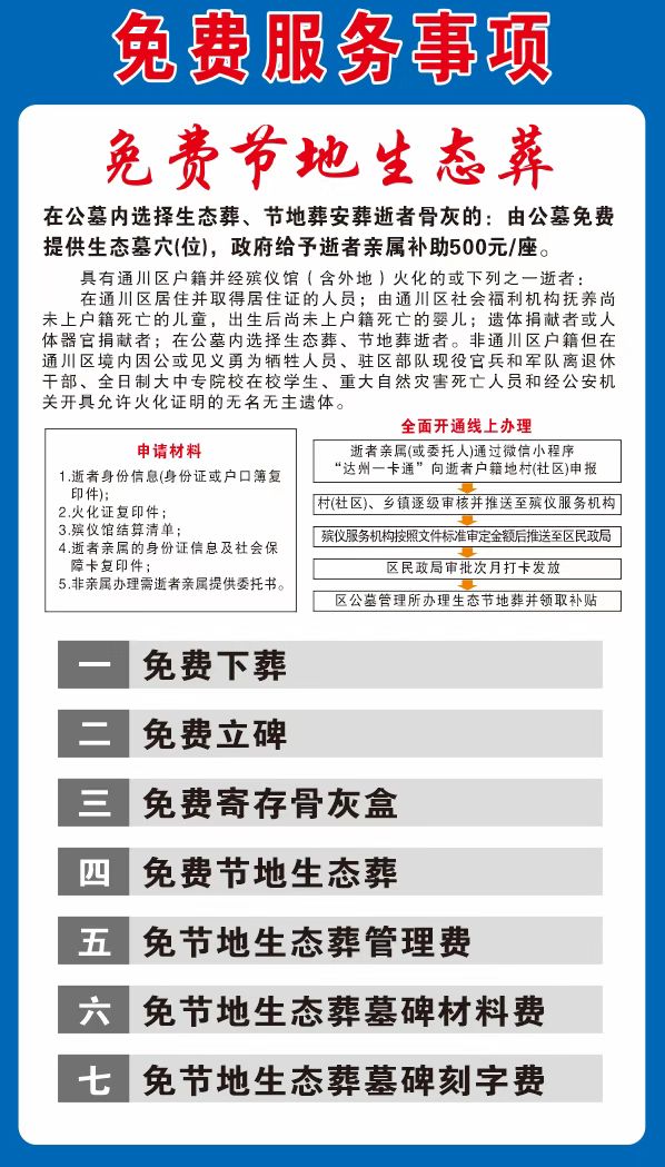 在公墓内选择生态葬、节地葬安葬逝者骨灰的:由公墓免费提供生态墓穴(位),政府给予逝者亲属补助500元/座。